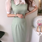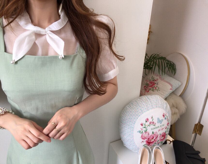 女性らしいビーンカラーのサスペンダーワンピースとネックリボンが大人可愛いシースルーブラウスの2点セット!!!