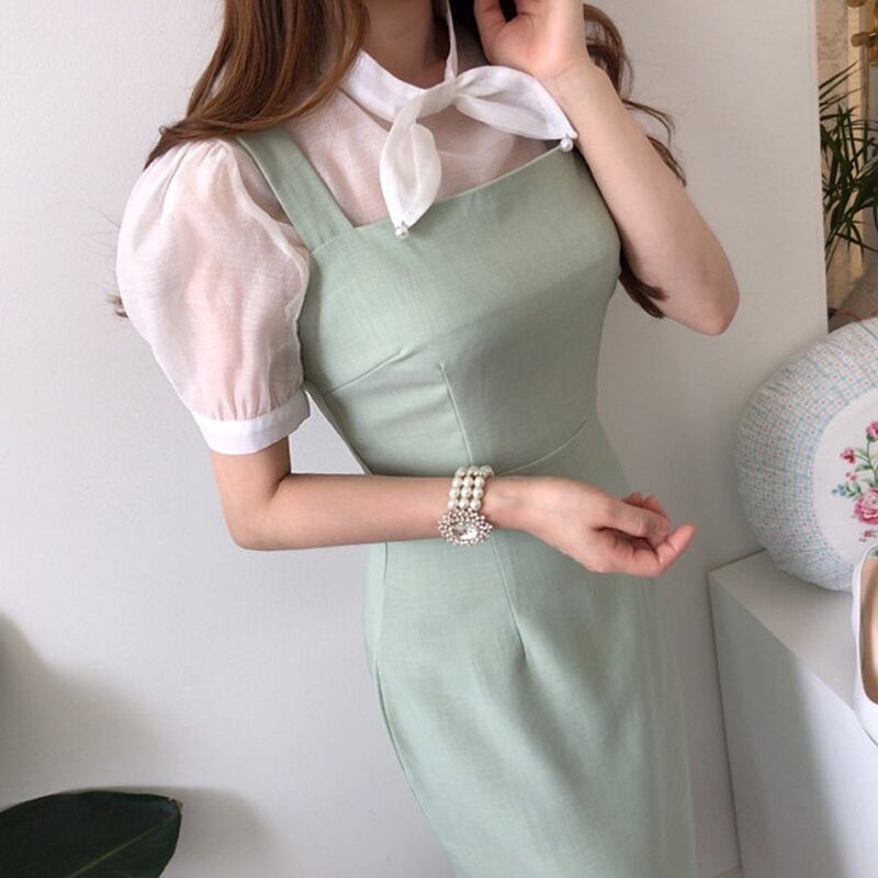【セット】シースルーブラウス+サスペンダーワンピース ドレス ツーピース スリム ハイウエスト エレガント 韓国 シック a2866
