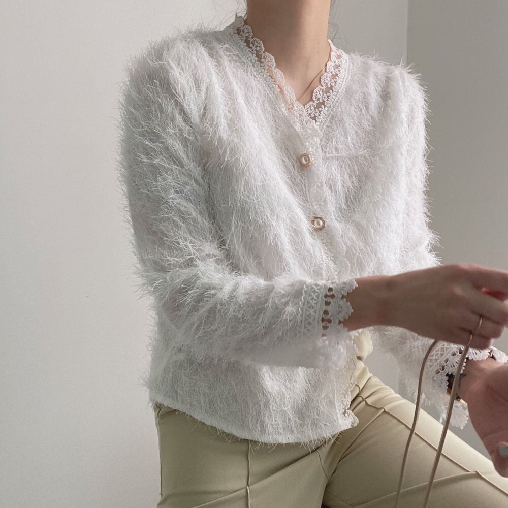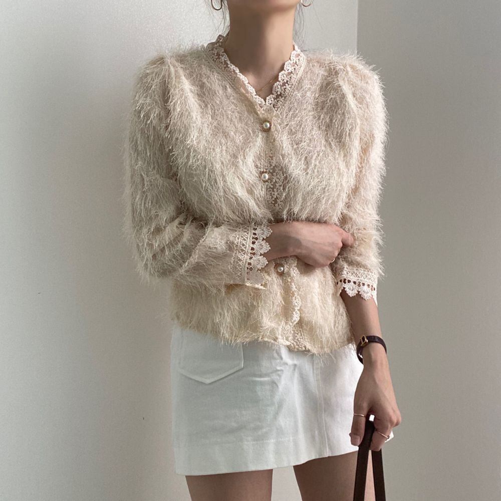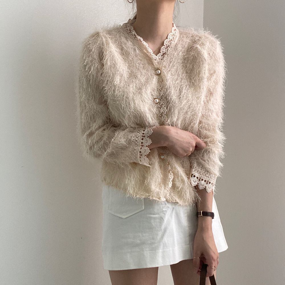 ふわふわフェザーにレースステッチが大人可愛いカーディガン