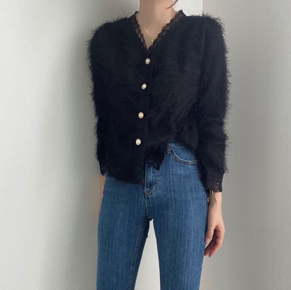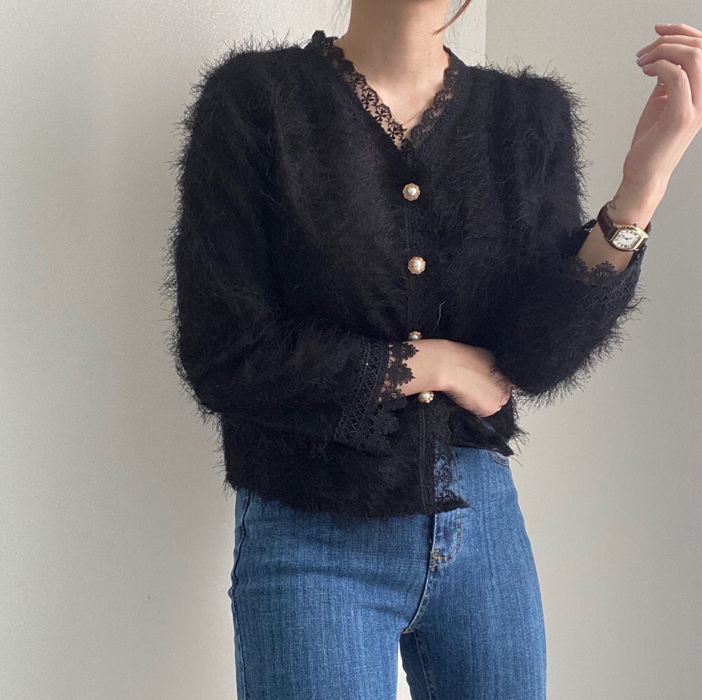 Vネック カーディガン フェザーカーディガン レースステッチ パールボタン. 韓国 シック 3カラー a914