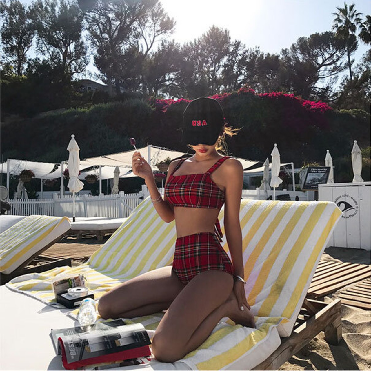 チェック柄 タンキニ ビキニ 水着 レディース ハイウエスト 赤 ベアトップ風 格子柄 スポーティー スタイルアップ カバー力 トレンド 新作 夏 海 プール リゾート a2972