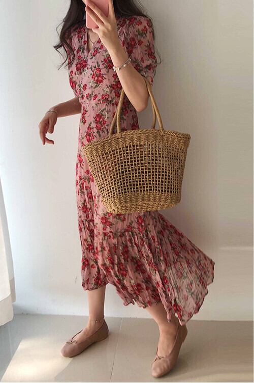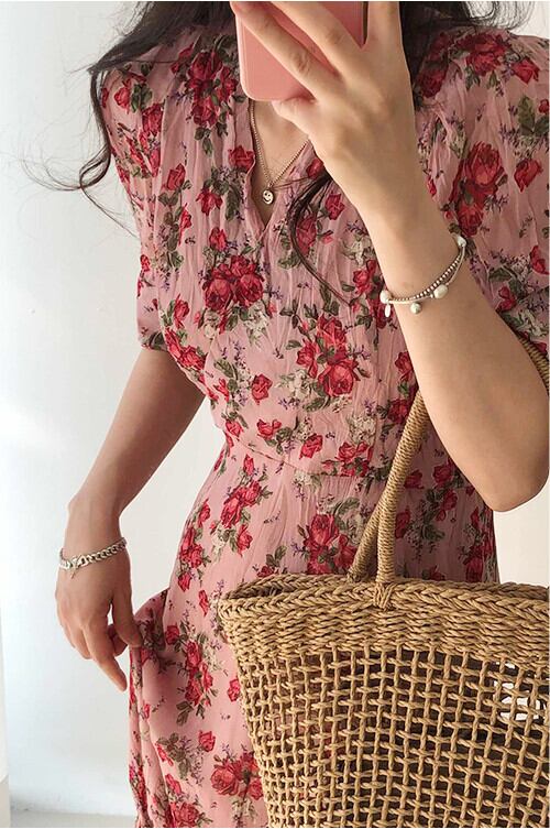 Vネック フラワー ワンピース 花柄 ドレス ウエスト スリミング スリム ロングワンピース かわいい 韓国 エレガント a2873