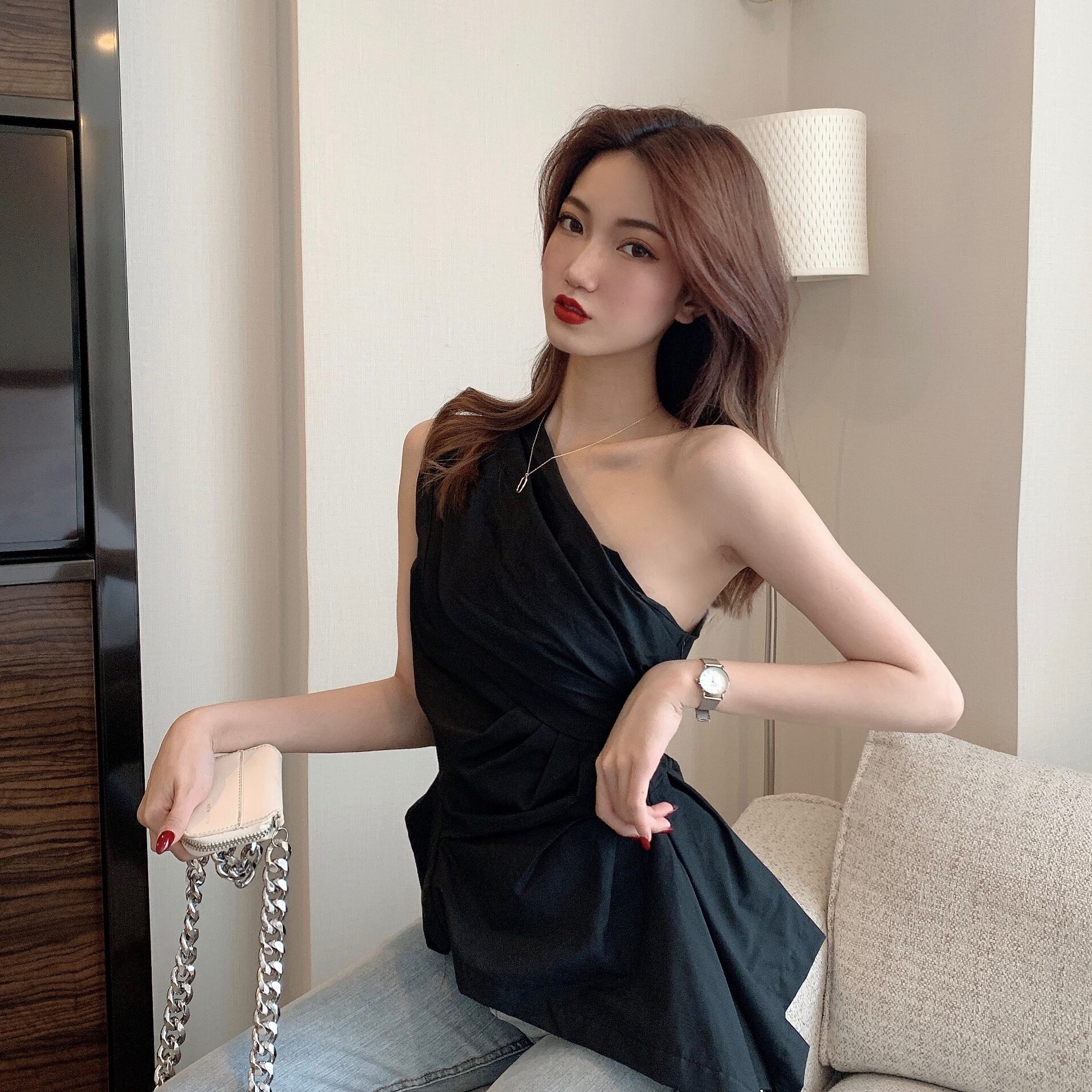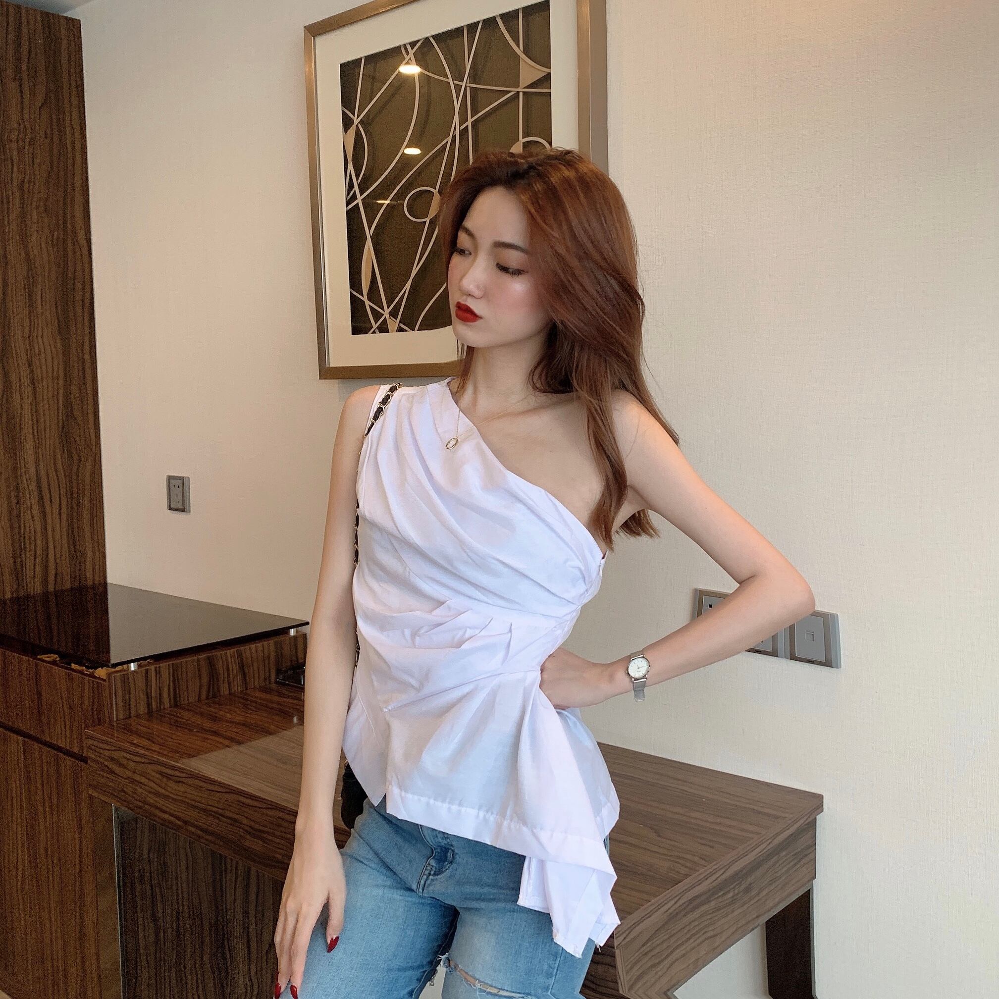 ワンショルダー フリルブラウス イレギュラー ノースリーブ 鎖骨美人 斜め肩 ウエストフリル. ブラウス シャツ 韓国 オルチャン. 2カラー a2899