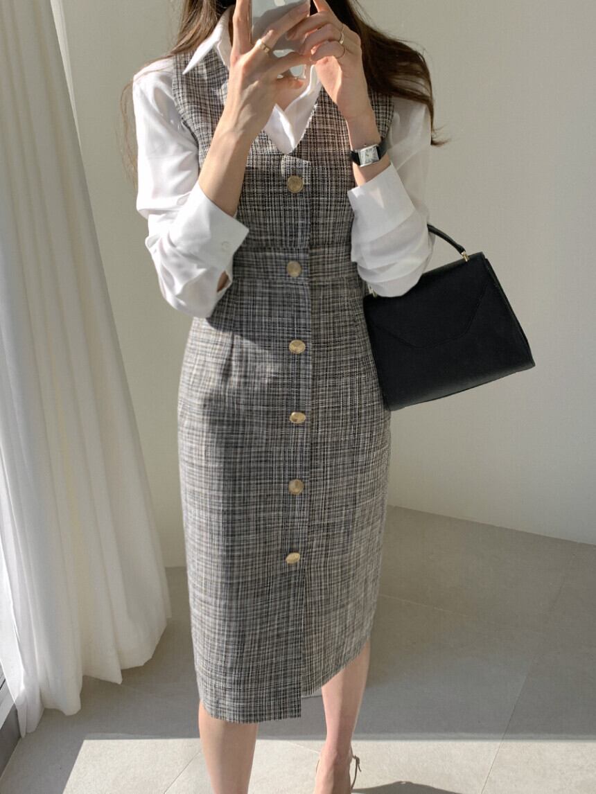 【2点セット】チェック柄 ノースリーブベストスカート+ボトミングシャツ お仕事コーデ セットアップ ツーピース 格子縞 シングルブレスト スリム 韓国 オルチャン 2カラー a2909