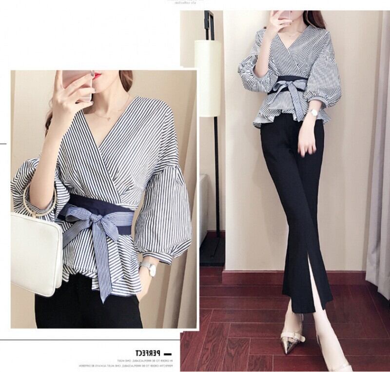 Vネック ストライプペプラムシャツ ストライプシャツ シャツ ブラウス ストライプ ウエストリボン ランタンスリーブ a2917