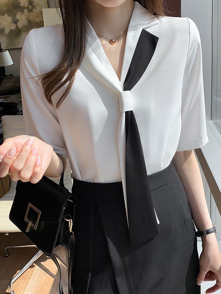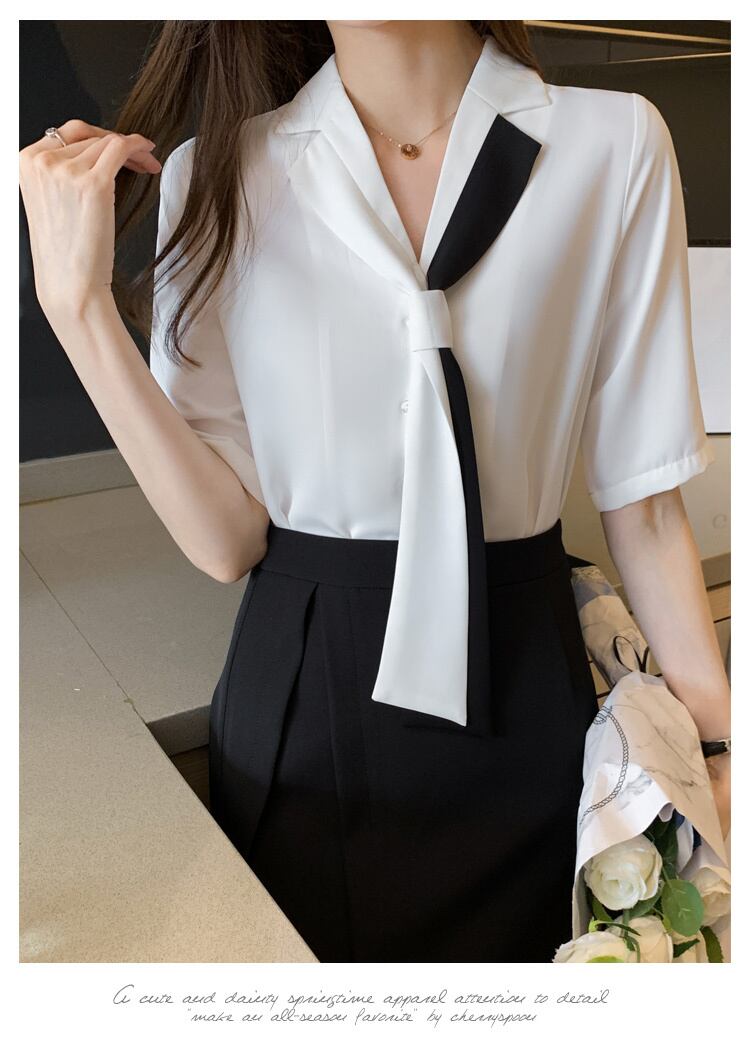 ボウタイ シフォンシャツ バイカラー 半袖シャツ リボン シャツ ブラウス お仕事コーデ スーツカラー 韓国 オフィスコーデ a2921