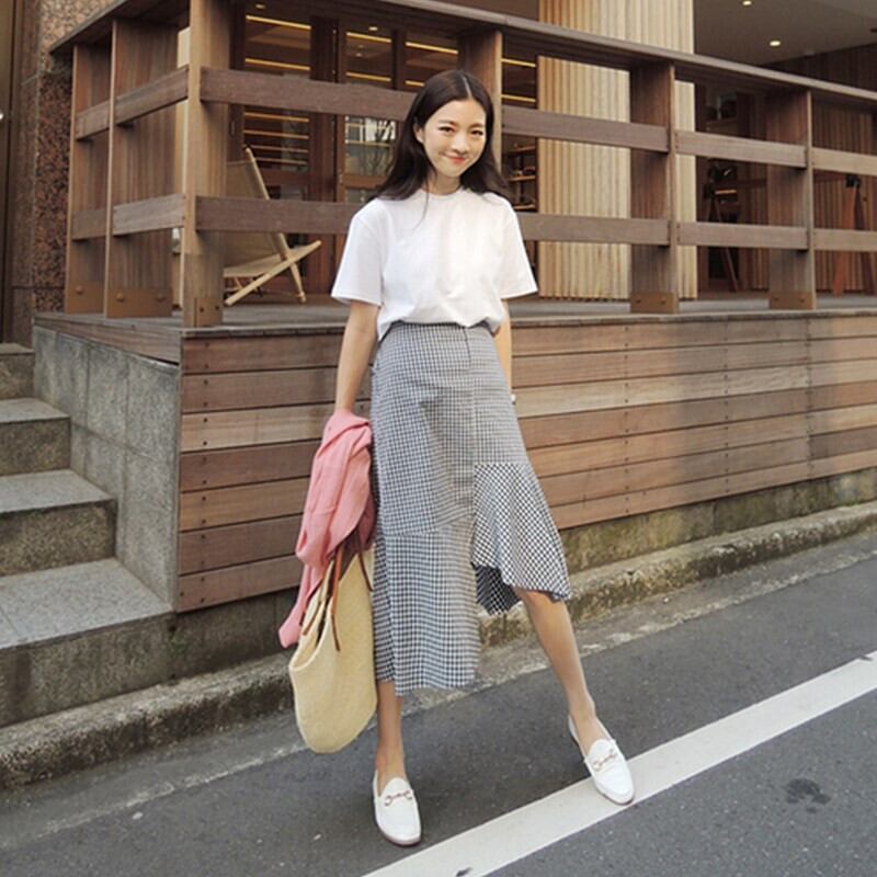 【セットアップ】半袖Tシャツ+チェック柄スカート アシメントリー スカート フレアスカート 白Tシャツ ツーピース 通学スタイル 通勤スタイル 韓国 オルチャン a2954