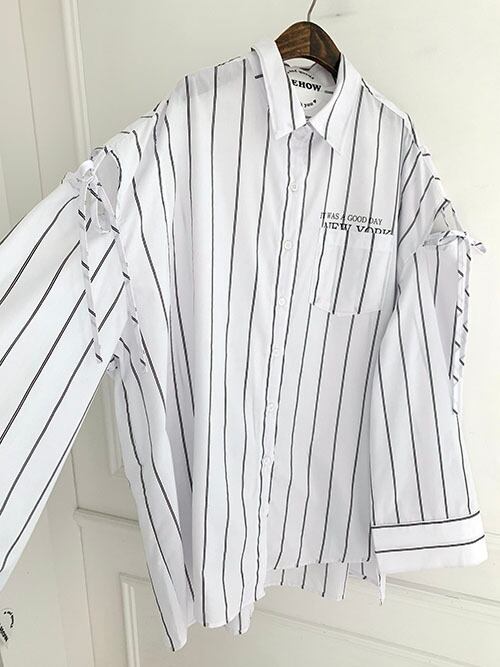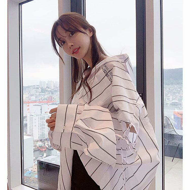 ストライプ長袖シャツ スリーブストラップ 長袖シャツ ルーズ イレギュラー ロングシャツ トレンド 韓国 a2993