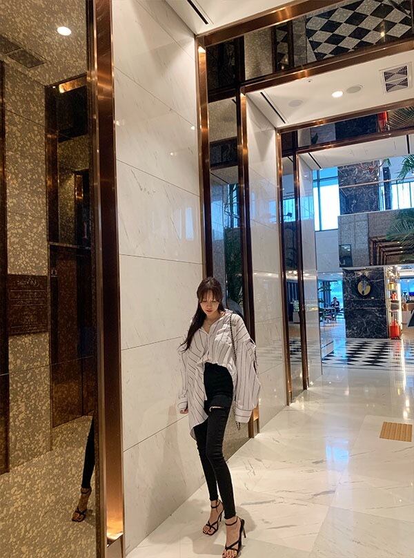 ルーズなサイズ感とストライプで着痩せ効果もあり、オシャレに着こなす事が出来ますよ^^