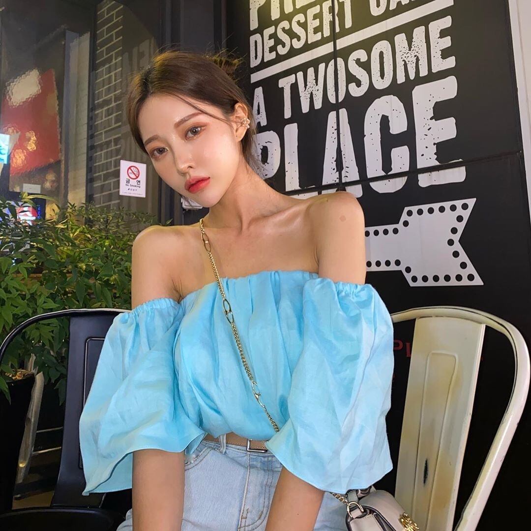 鮮やかなスカイブルーが夏にピッタリのオフショルダートップス
