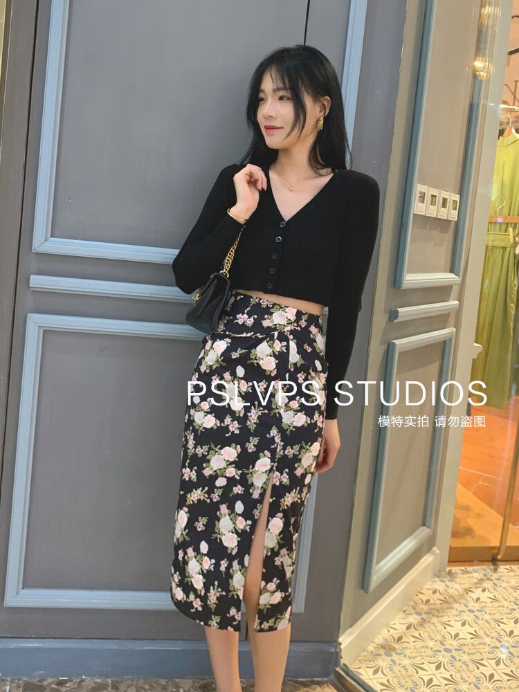 ブラックフローラルスカート 花柄 スプリット ミドル丈. バッグヒップスカート スカート ハイウエスト a3006