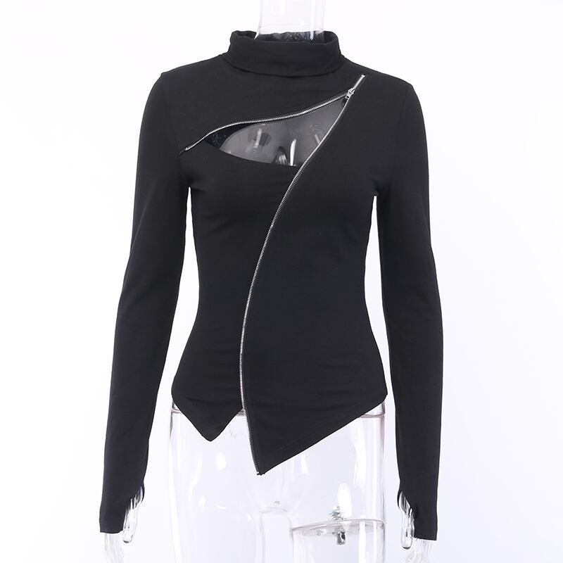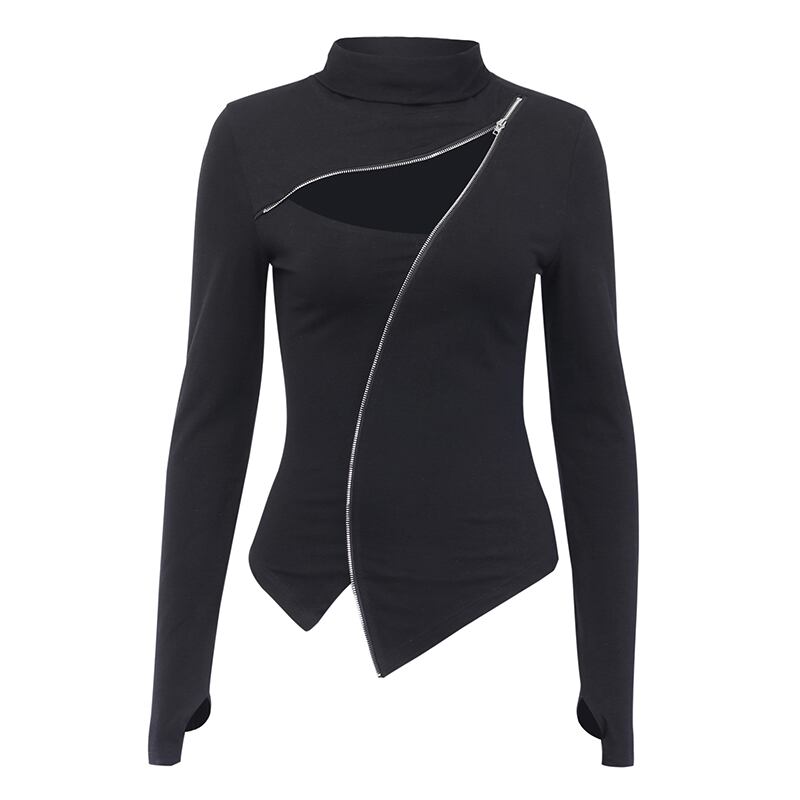 不規則ジッパー 長袖トップス バストオープン 長袖Tシャツ ハイネック パンクスタイル セクシー 薄い スリム ストリートコーデ アシメントリー. ブラックコーデ a3012