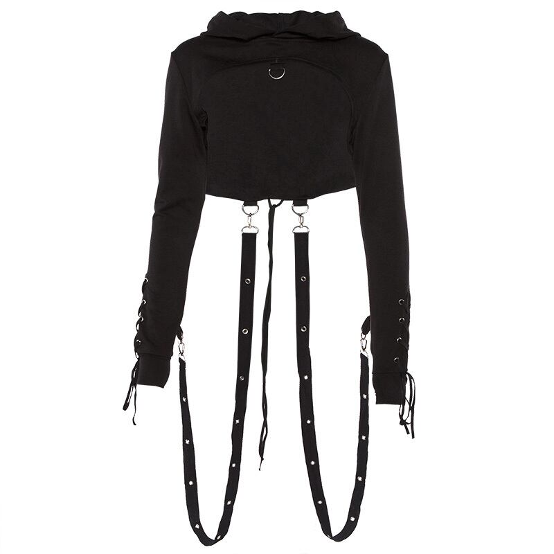 サスペンダー付き レースアップ ショート丈パーカー 編み上げ パーカー 長袖 モード系 ゴスロリ ゴシック ロリータ レディース 黒 ブラック 個性的 カットソー フーデッド ロングサスペンダー パンク a3014