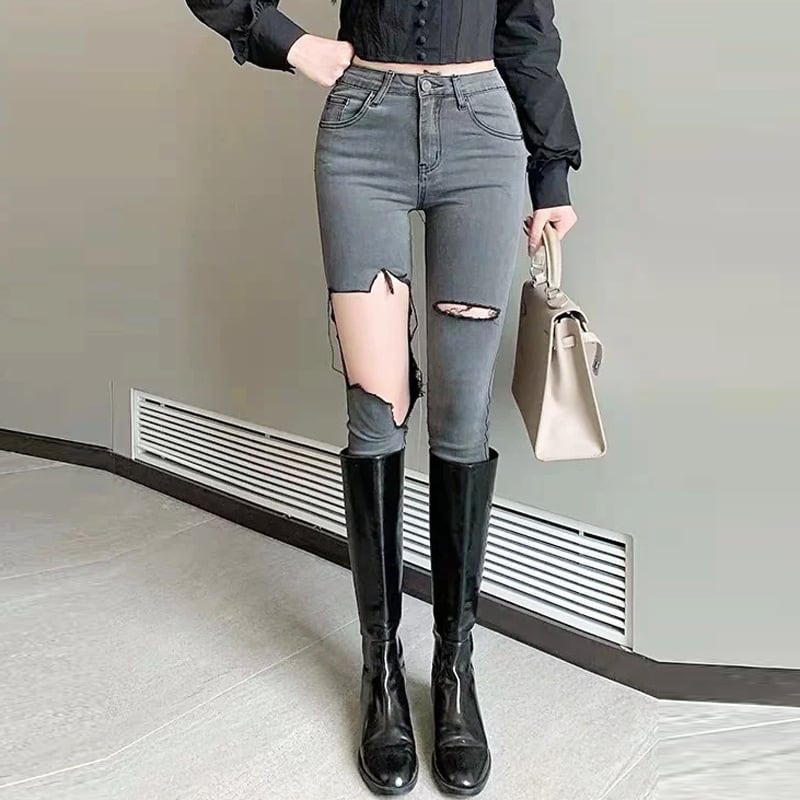 大胆に入ったダメージがオシャレなダメージスキニージーンズ