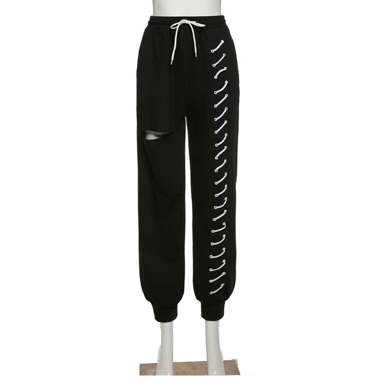 ドローストリングダメージワイドレッグパンツ ダメージスウェット スポーツパンツ レディース ルーズ ホールレース スウェット カジュアルパンツ ダンスパンツ ストリート アメカジ a3066