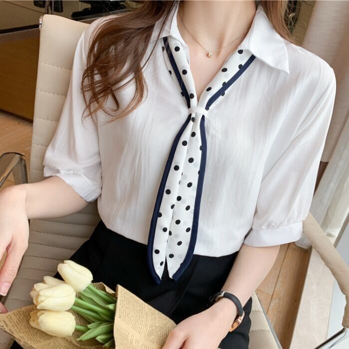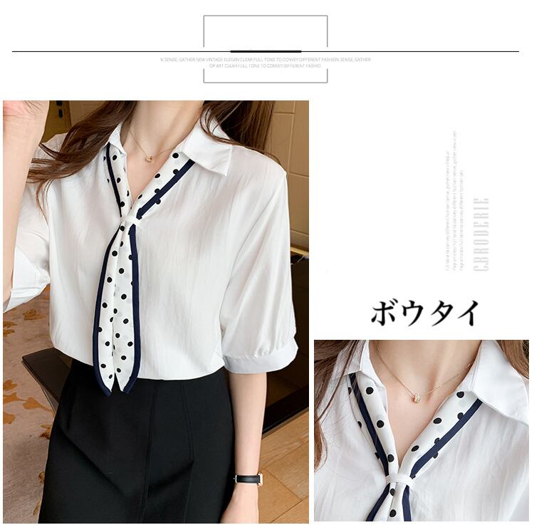 ボウタイ 半袖シャツ ブラウス. シャツ シフォンシャツ レディース ドット柄 ボーダー柄 お仕事コーデ ルーズ 韓国 夏 a3060