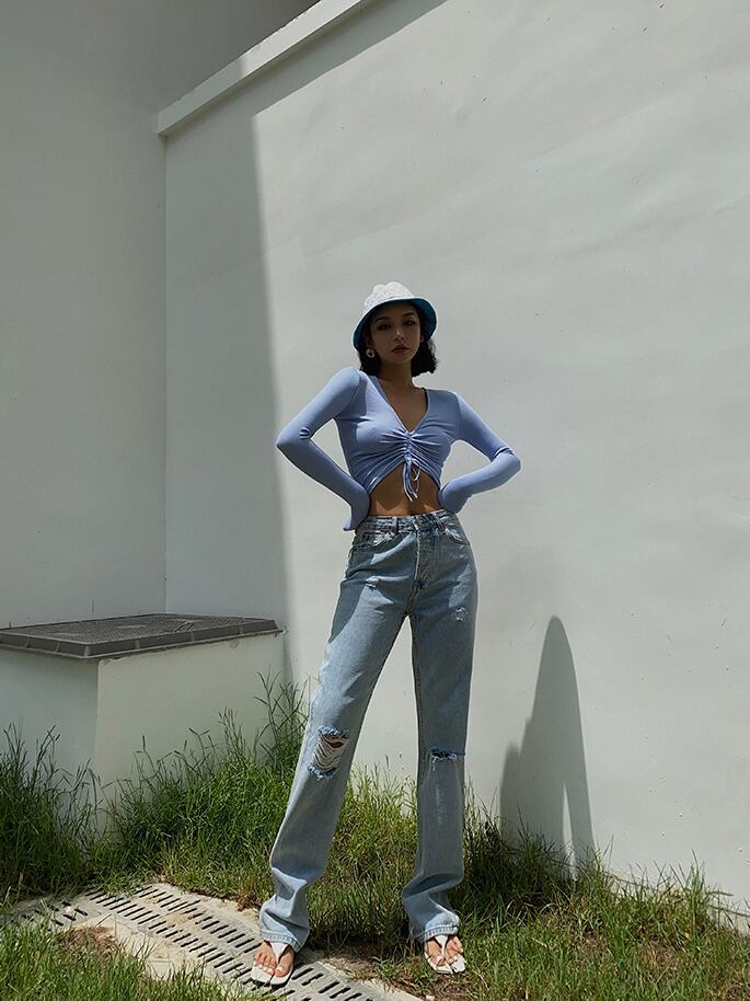 ダメージストレートジーンズ ハイウエスト ストレート ジーンズ デニム レトロ パンツ ボトムス レトロ 2カラー a3080