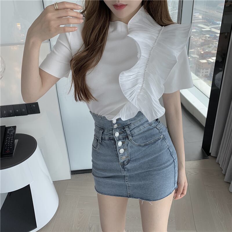フリル半袖Tシャツ 半袖Tシャツ アシメントリー フリル 薄手 韓国 オルチャン レトロ 夏 ラウンドネック a3087