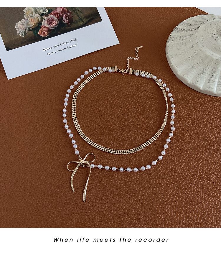 パールネックレスにリボン×ゴールドチョーカーが可愛いダブルネックレス