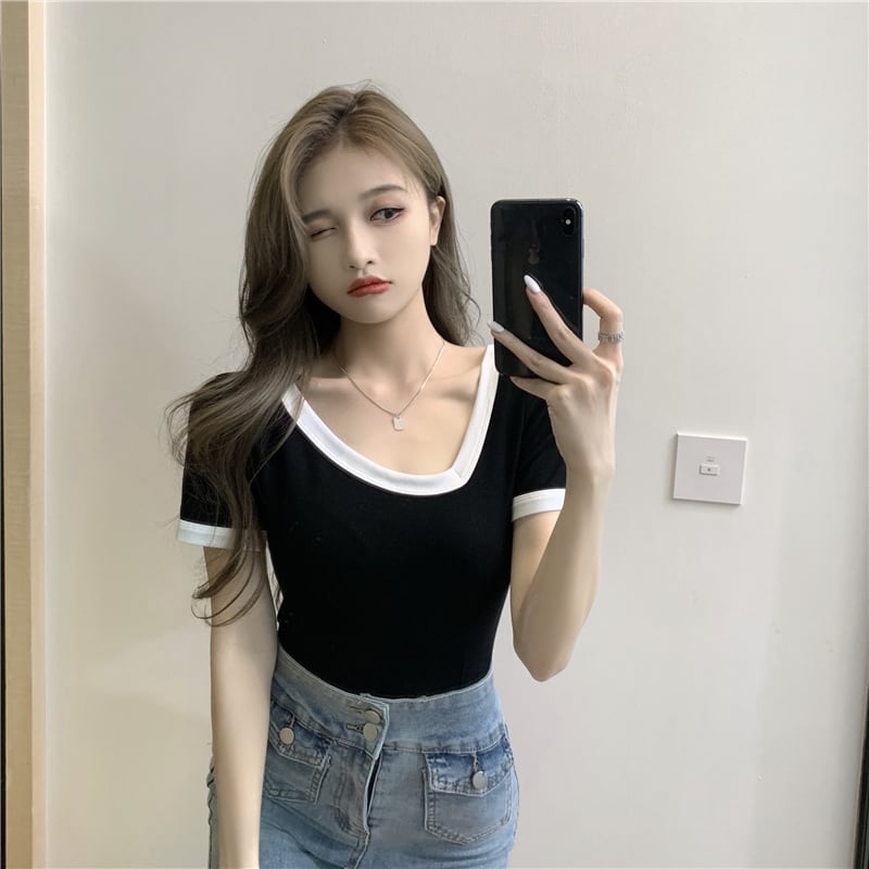 スクエアVネック半袖Tシャツ タイトフィット ショート丈Tシャツ 半袖Tシャツ バイカラー 夏 レディース トップス トレンド 韓国 オルチャン 2カラー a3162