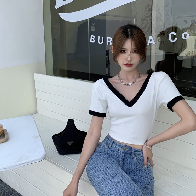 Vネックショート半袖Tシャツ ミニT 半袖Tシャツ タイト ショート丈 スリミング ボトミング トップス レディース 夏 バイカラー トレンド 韓国 オルチャン 3カラー a3166