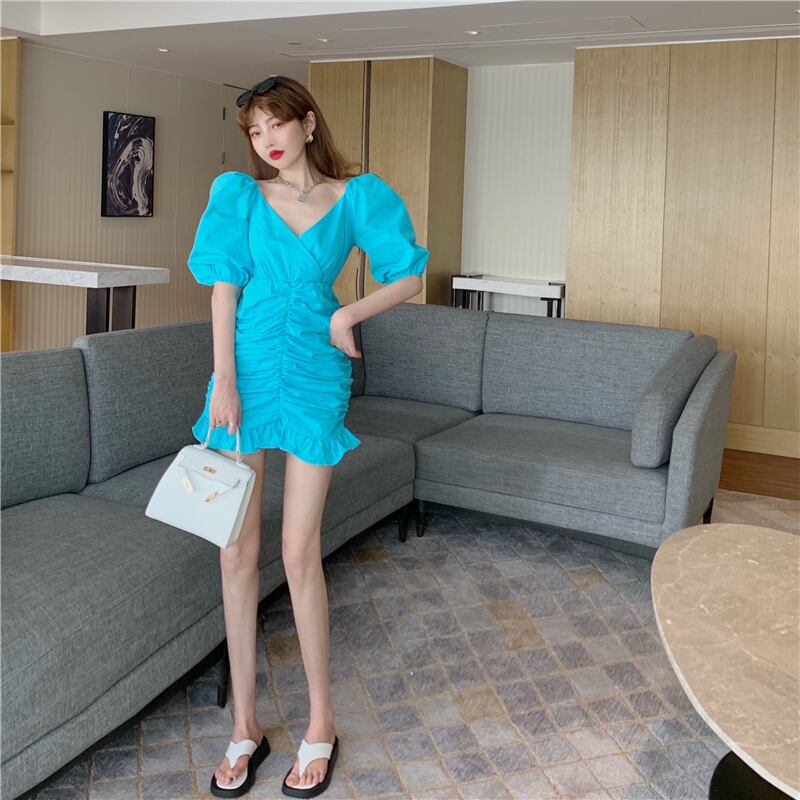 Vネックプリーツワンピース パフスリーブ フリルドレス フランチ レトロ ワンピース ドレス ミニワンピ 2カラー. a3167