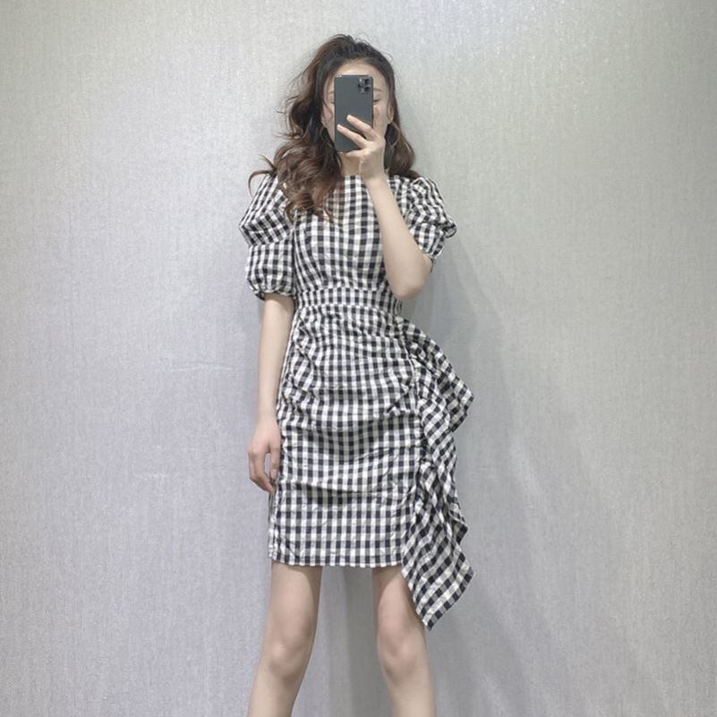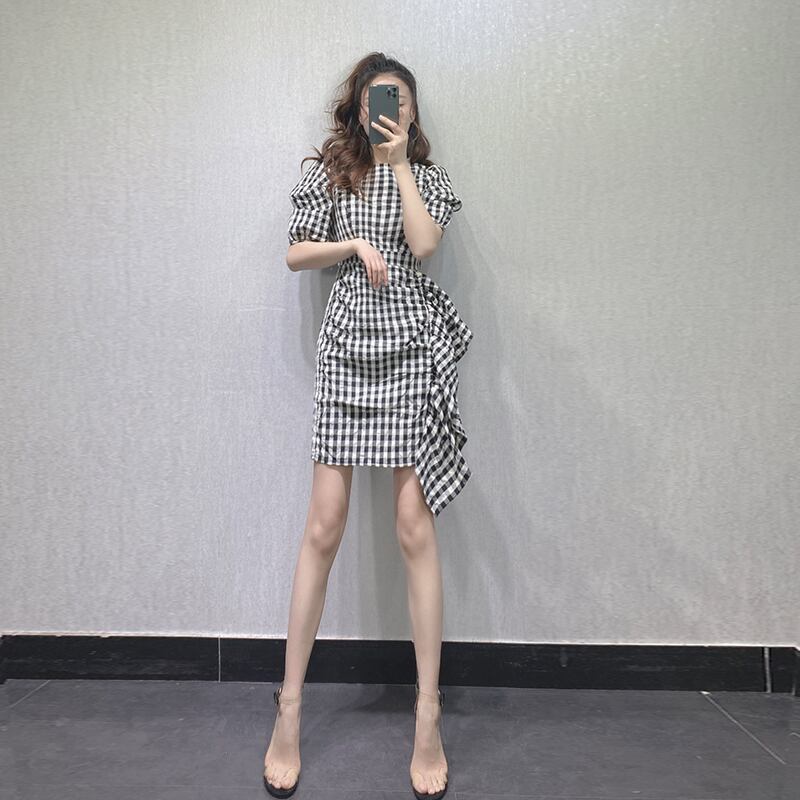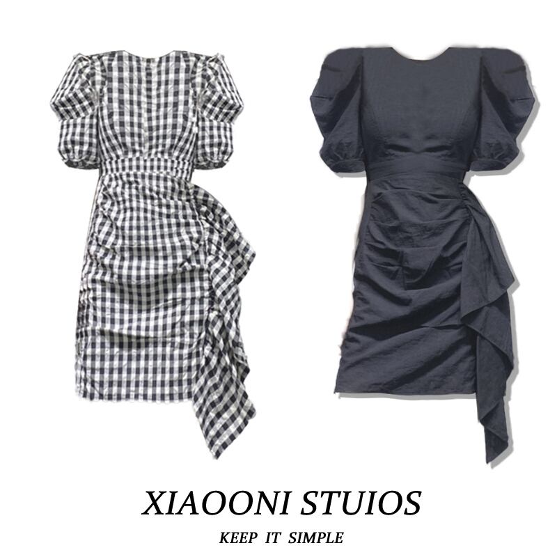 サイドフリルワンピース チェック柄 ブラック フレンチ レトロ パフスリーブ ワンピース ドレス 半袖ワンピース フリルワンピ 2カラー a3256