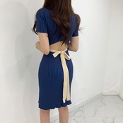 バックオープン半袖ニットワンピース リボンワンピース ニットワンピース 半袖ワンピ ラウンドネック スリム タイトワンピース セクシー 2カラー a3224