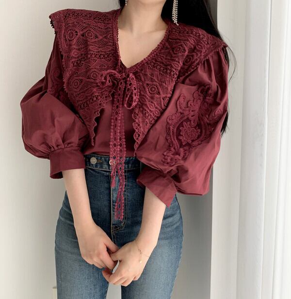 ビックカラー 刺繍レースブラウス パフスリーブ シャツ ルーズ ブラウス 韓国 長袖 3カラー a3310
