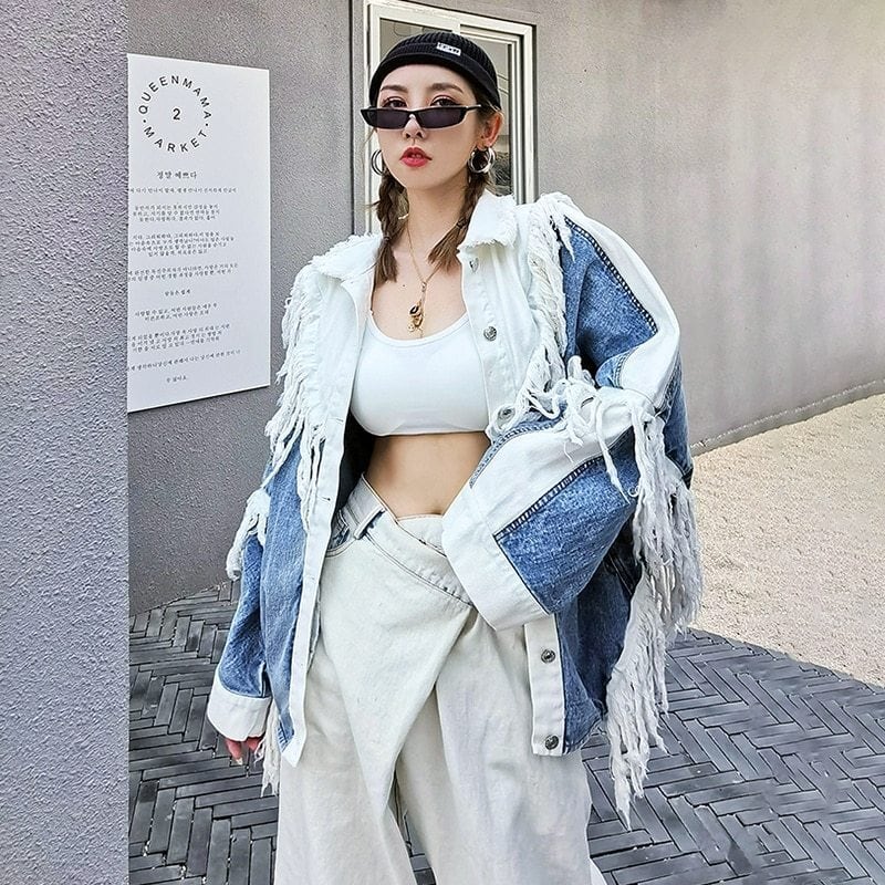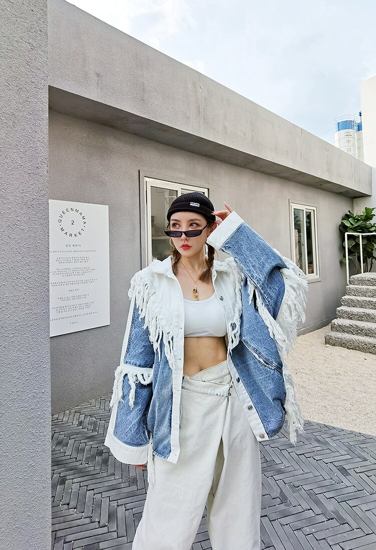 フリンジデニムジャケット レディース デニムジャケット ルーズ ミドル カジュアル ジャケット トレンド a3344