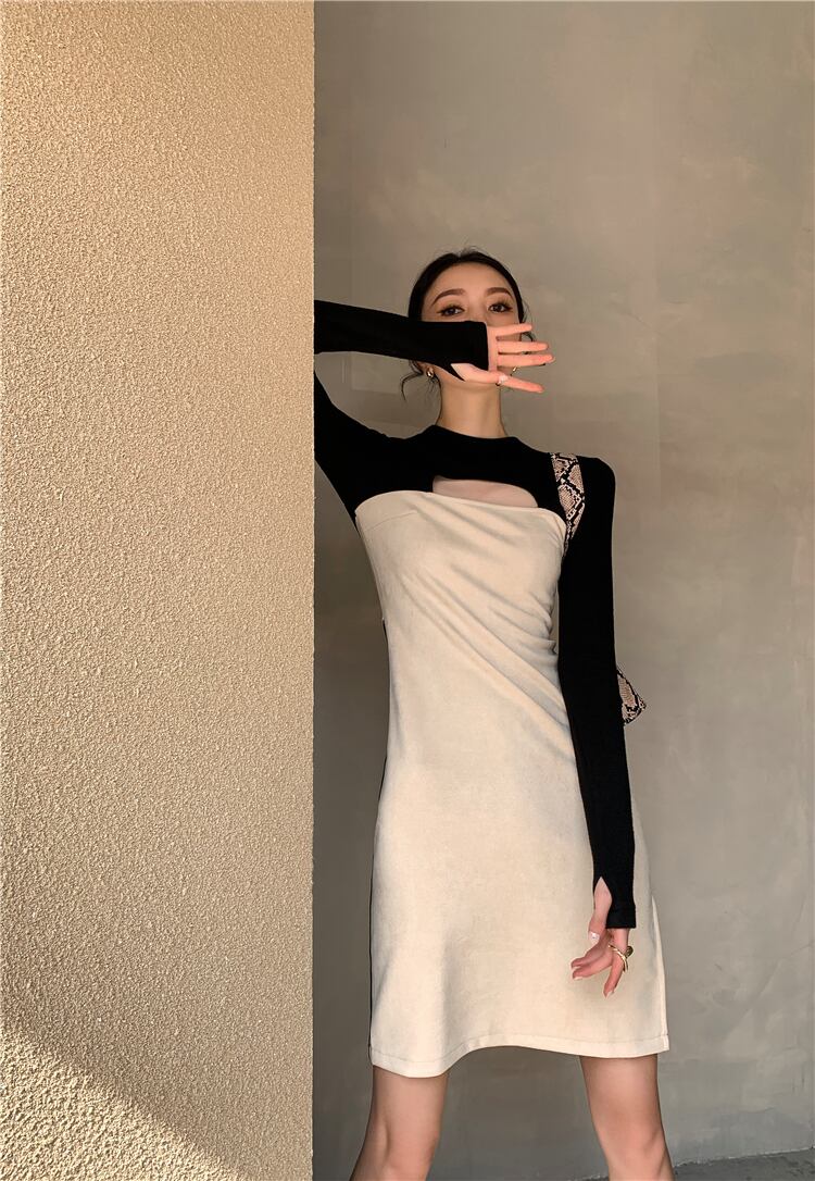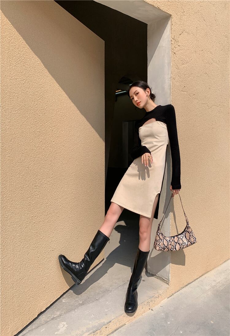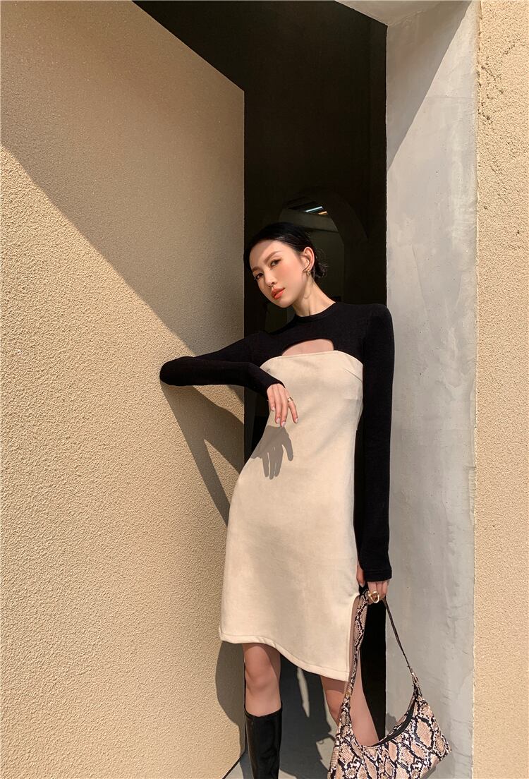 胸元スリットワンピース ワンピース ドレス 長袖ワンピース スエード ニット コントラストカラー トレンド a3347