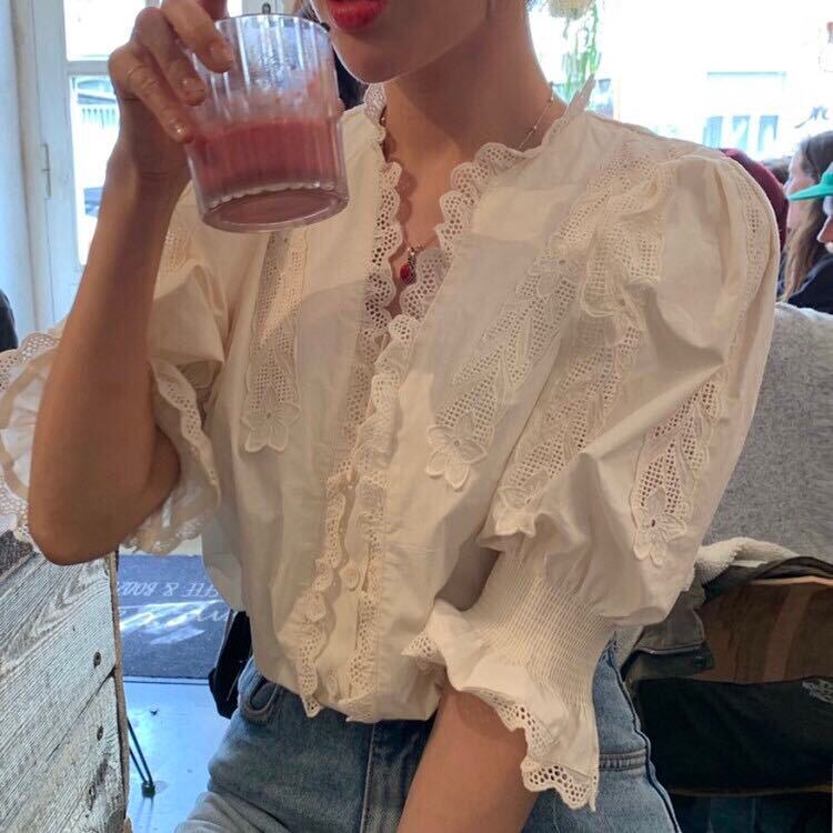 フレンチレース刺繡ブラウス ブラウス パフスリーブ シャツ レトロ 韓国 Vネック. a3365