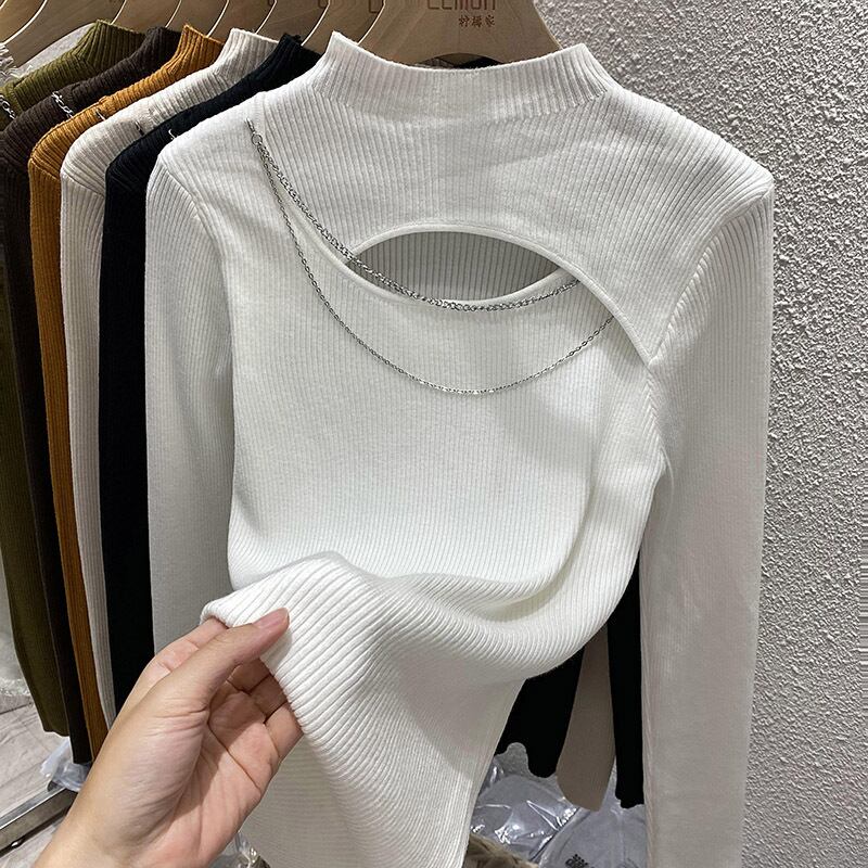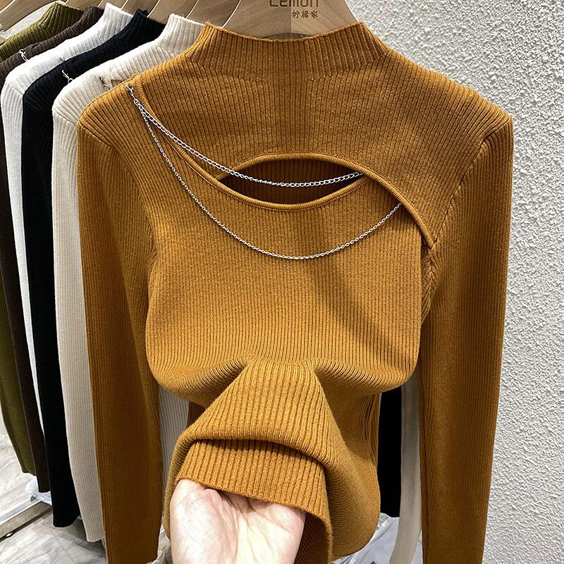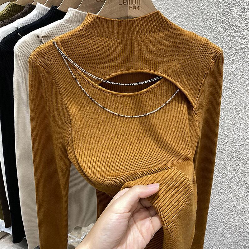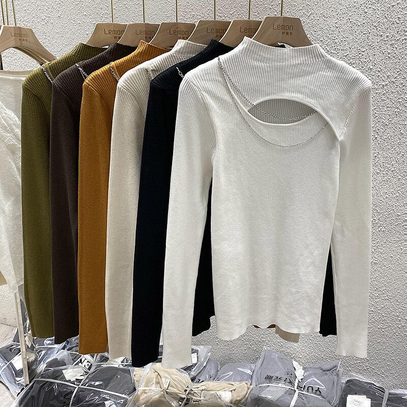 【チェーン付き】胸元スリットハーフハイネックセーター 長袖 ボトミングトップス リブニット セーター ニット 秋冬 韓国 6カラー a3367