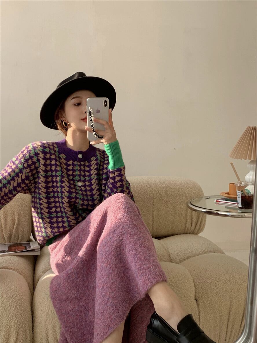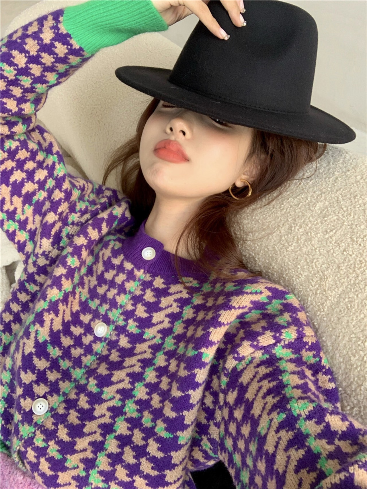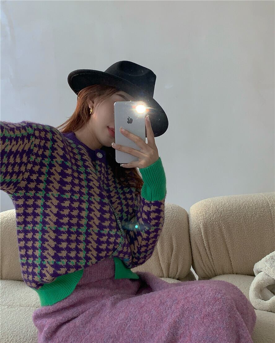 チェック柄 ニットカーディガン カーディガン 韓国 レトロ a3369