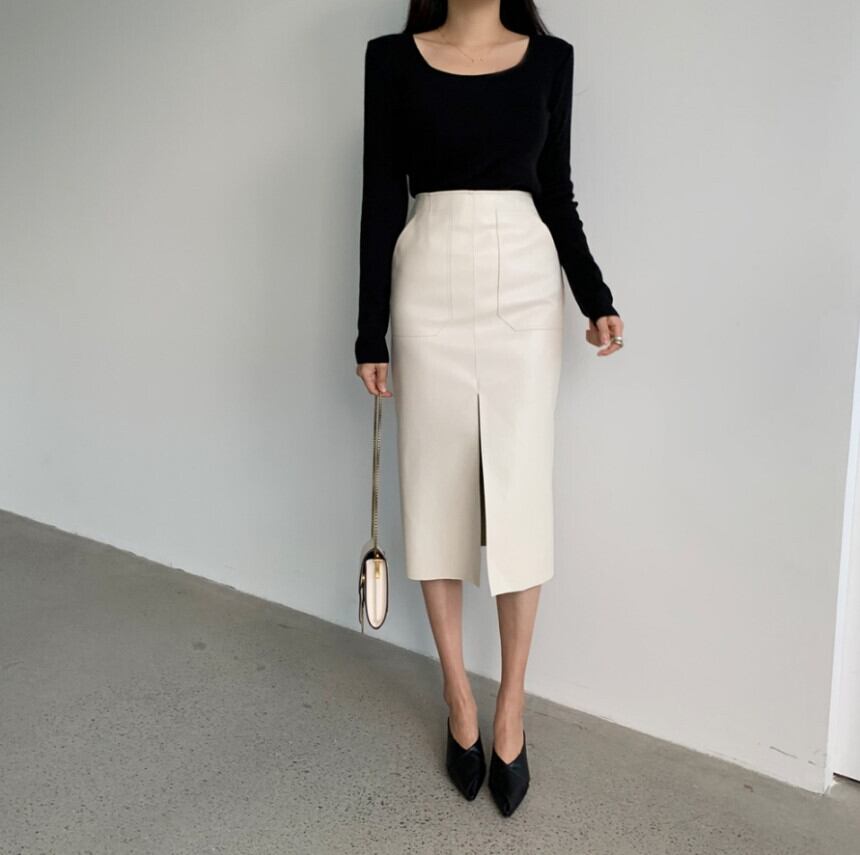 レザースカート PUレザースカート ミドル丈 ストレート スリット ハイウエスト スカート トレンド 秋冬. 韓国 a3407