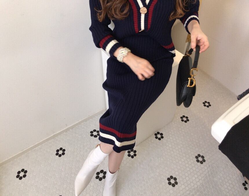 コントラストカラーのラインをリンクさせたカーディガンとタイトスカートのセットアップ。