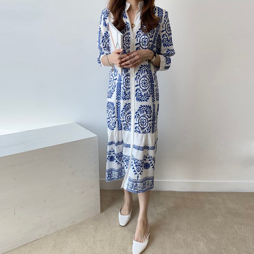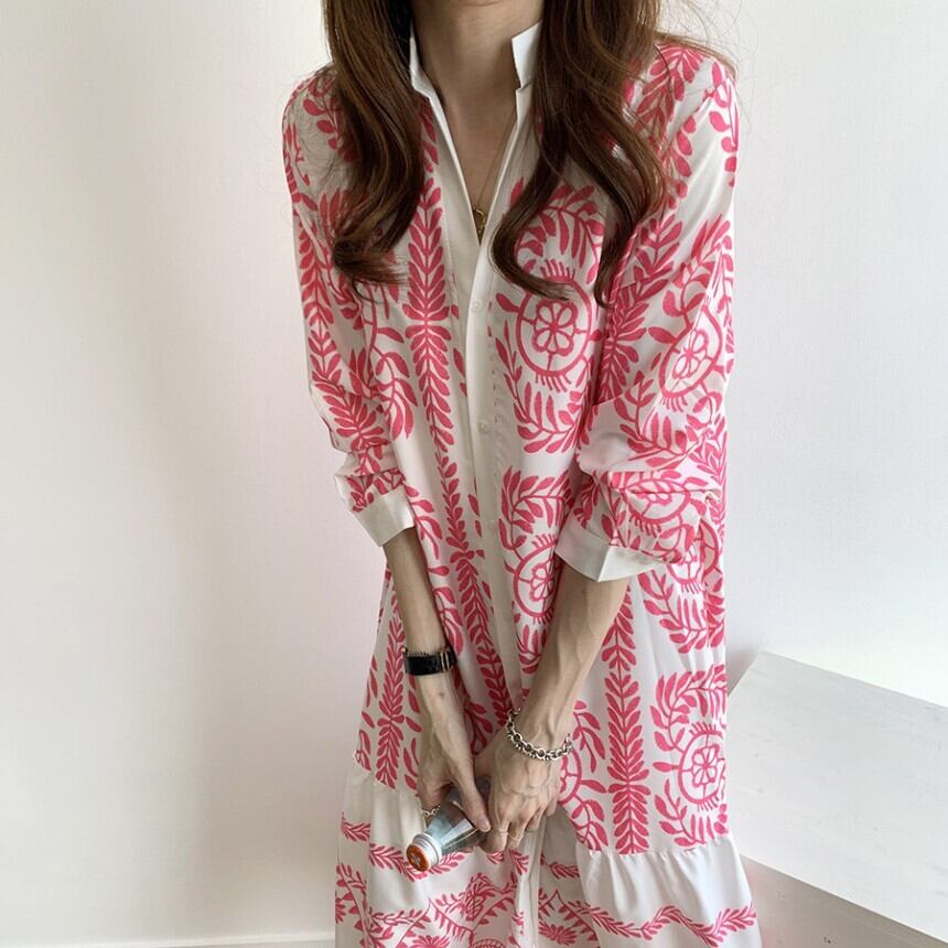 長袖シャツワンピース シャツワンピース ワンピース プリントワンピ 秋 シック 長袖 シャツ. a3427