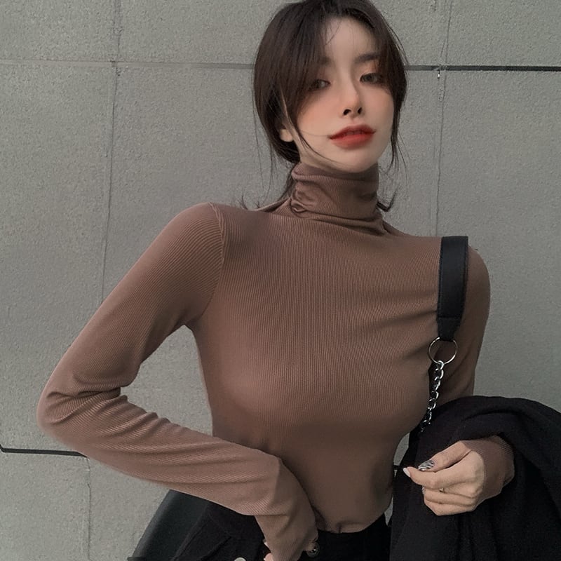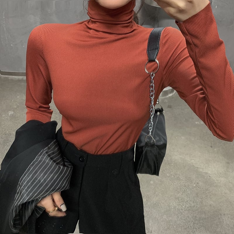 タートルネックリブトップス ボトミングシャツ 長袖Tシャツ リブニット レディース 秋 冬 無地 ストレッチ トップス a3462