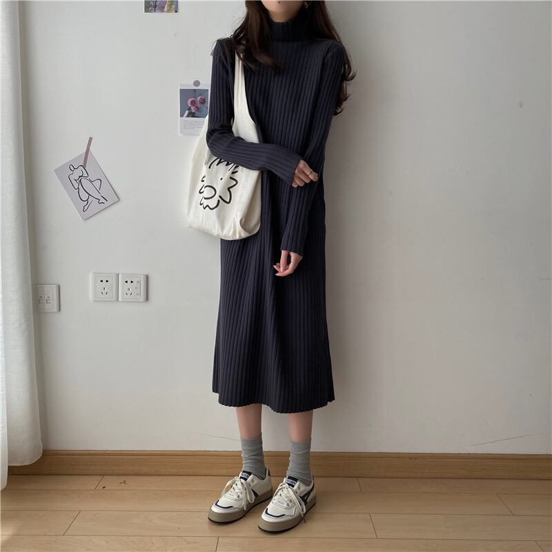 ハーフハイネックニットワンピース ミドル丈. セーター ニット ニットワンピース ワンピース 秋冬 リブニット a3491