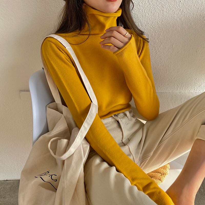 ハイネックボトミングシャツ スリム ストレッチ プルオーバー セーター 韓国 レトロ 長袖 無地 a3545
