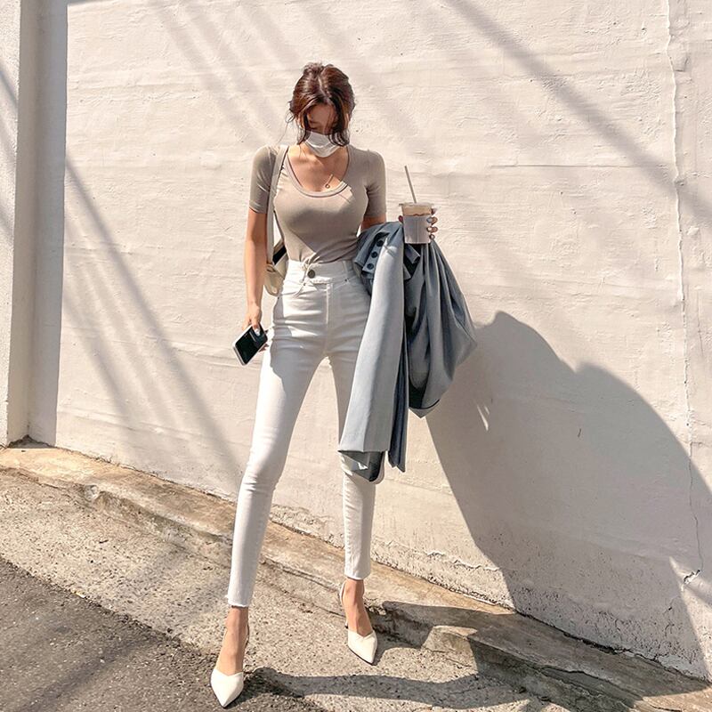 ホワイトジーンズ ストレッチジーンズ デニム ジーンズ ハイウエスト 無地 9分丈 美脚. a3561