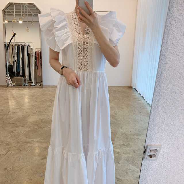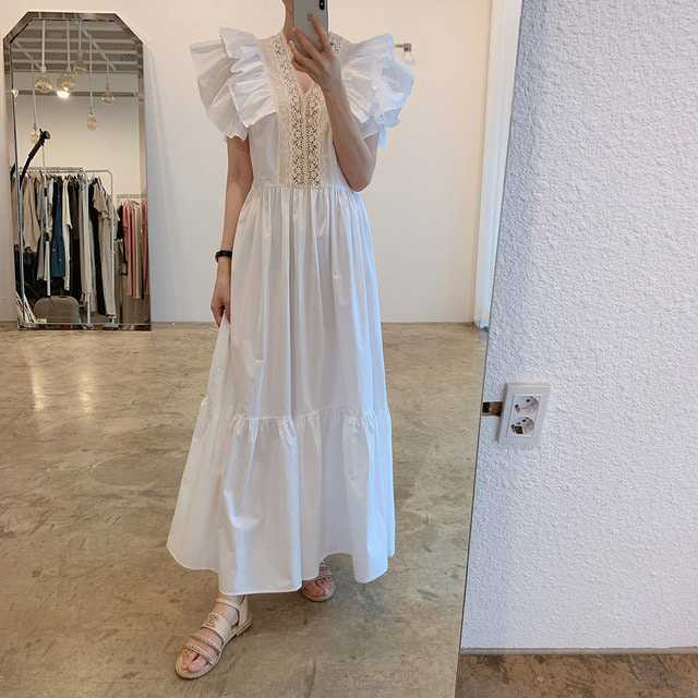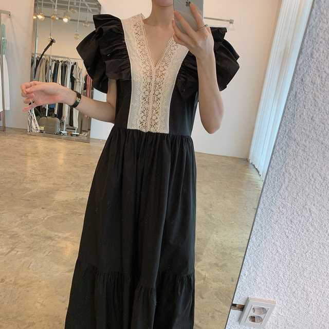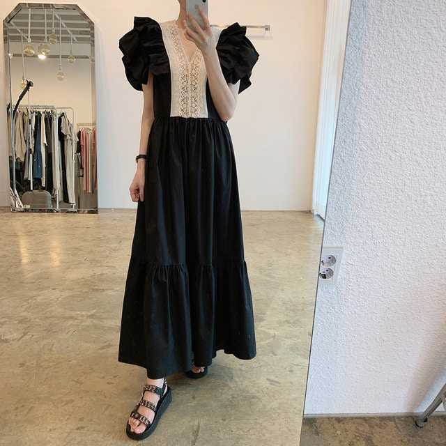 Vネックレースワンピース. フリルスリーブ ワンピース ドレス ロングワンピース ハイウエスト 韓国 エレガント. 2カラー a3564