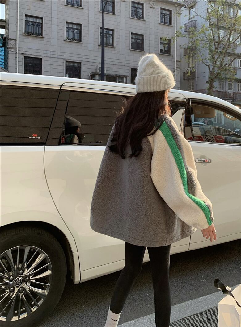 グリーンの差し色にトリコロールカラーがオシャレなボアコート