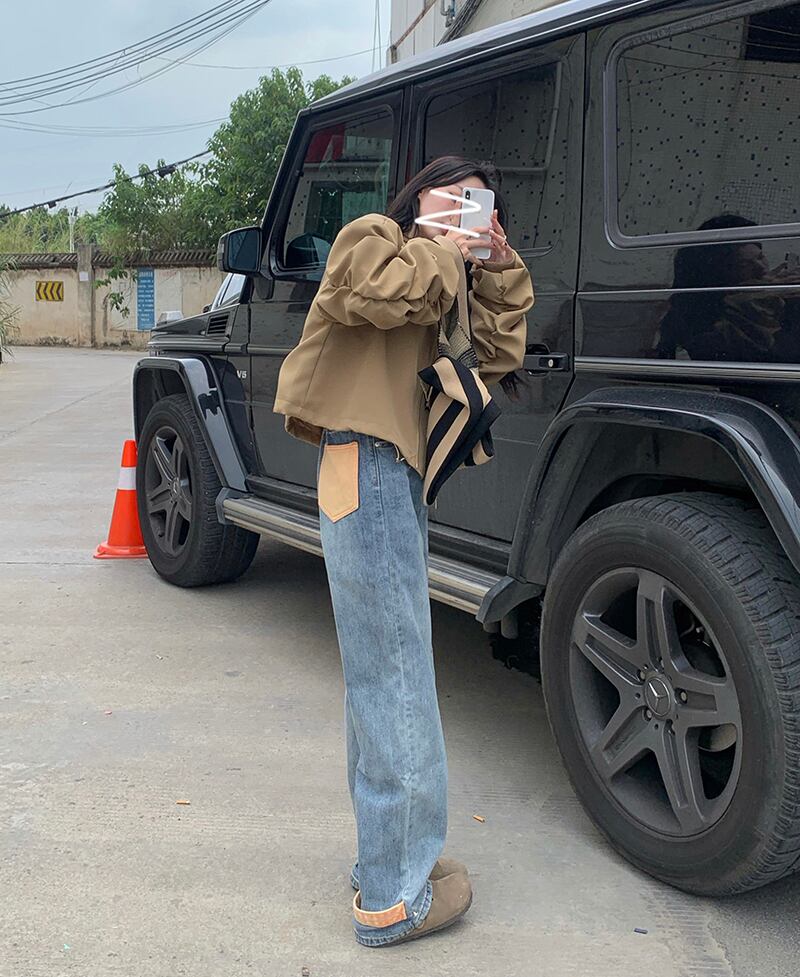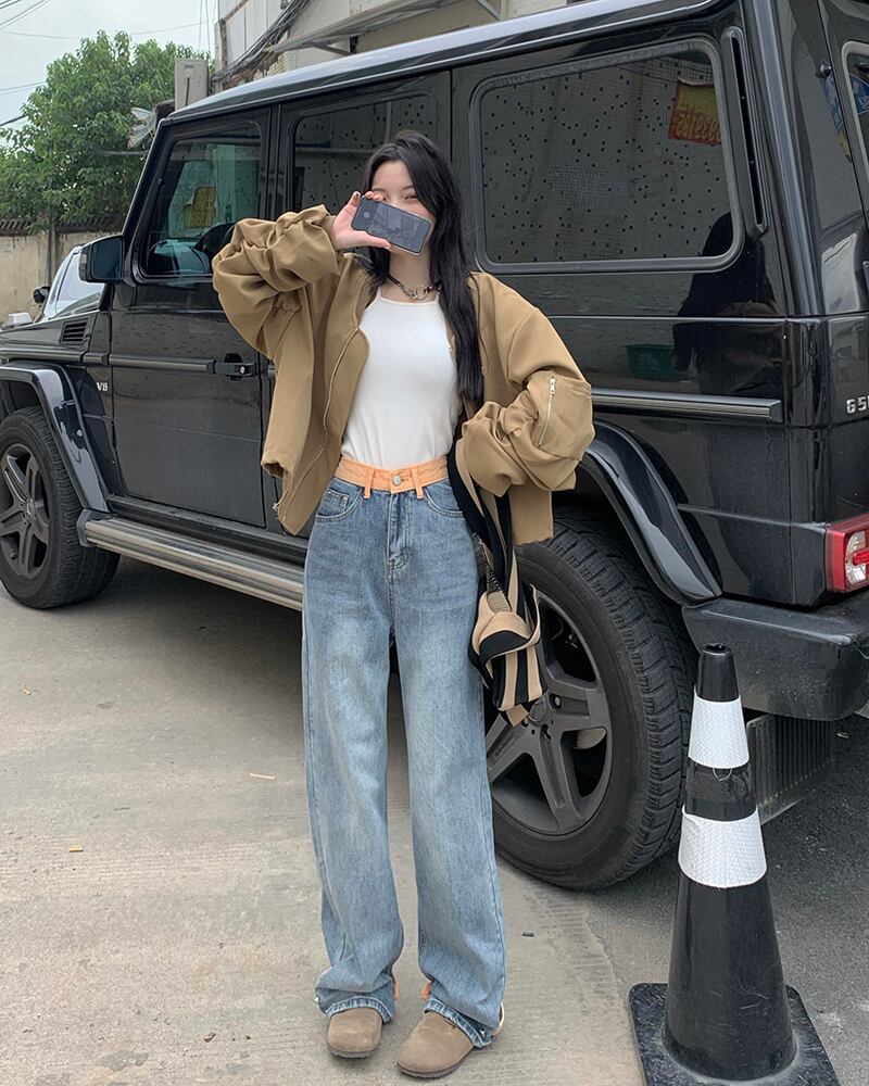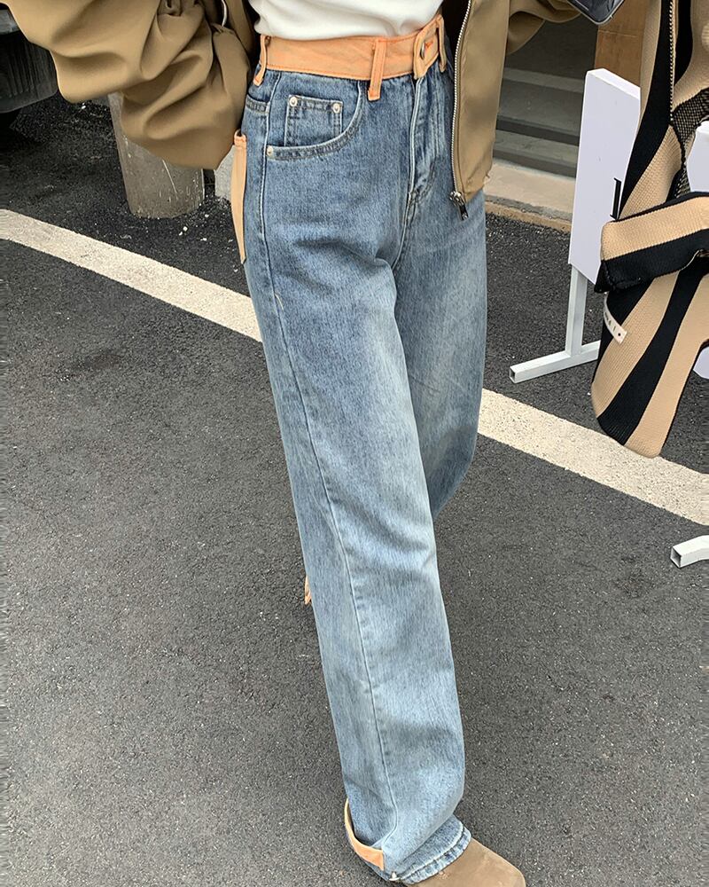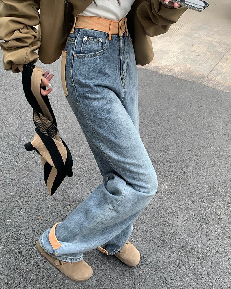 コントラストカラージーンズ デニム ストレートジーンズ ハイウエスト ジーンズ レディース ルーズ a3581
