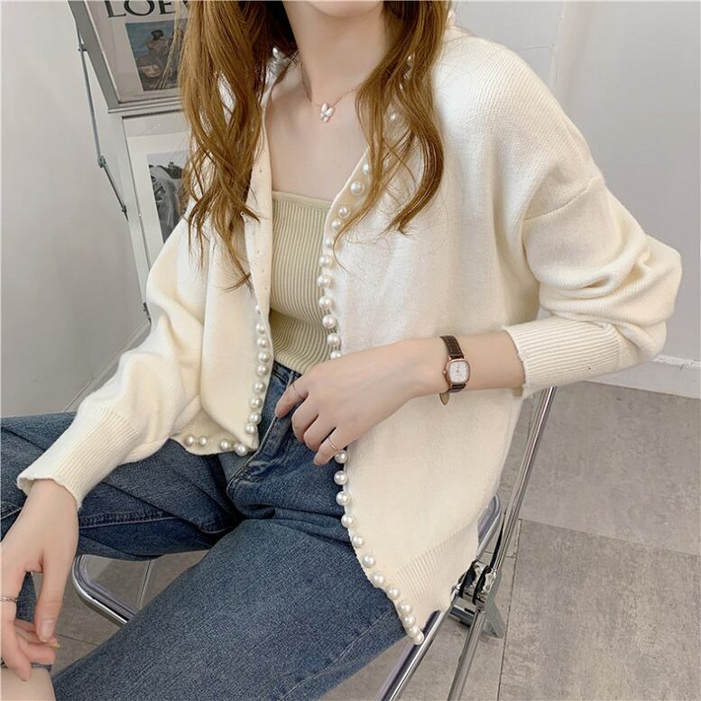 Vネックパールカーディガン Vネックカーディガン フロントパール ビジューカーディガン 長袖カーディガン カーディガン 2カラー a3754