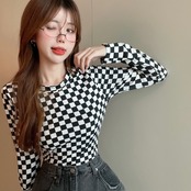 チェッカーボード柄 ボトミングシャツ ショート丈 インナーTシャツ 長袖Tシャツ インナーシャツ a3595