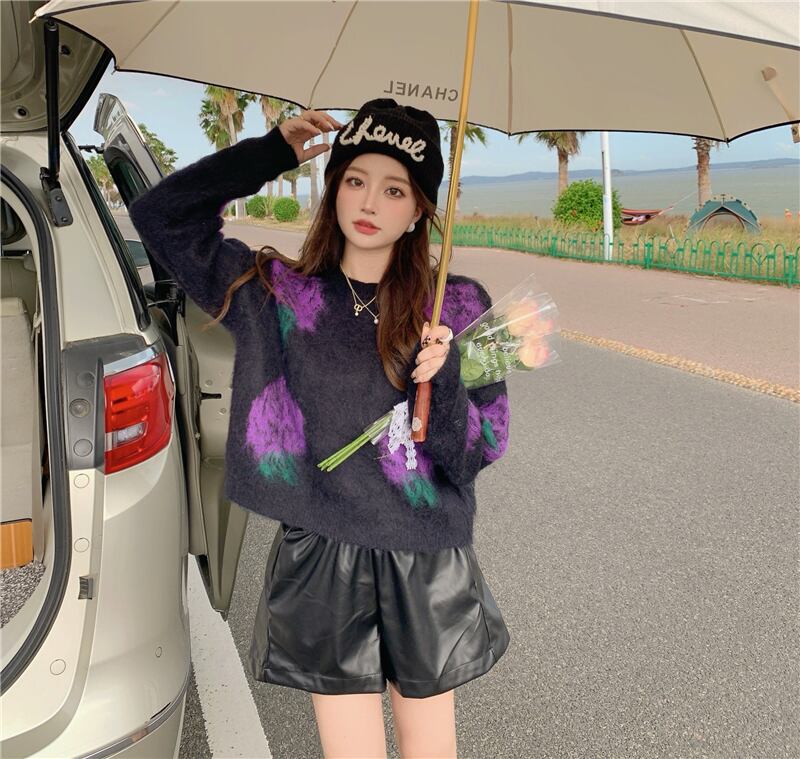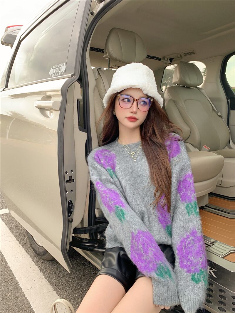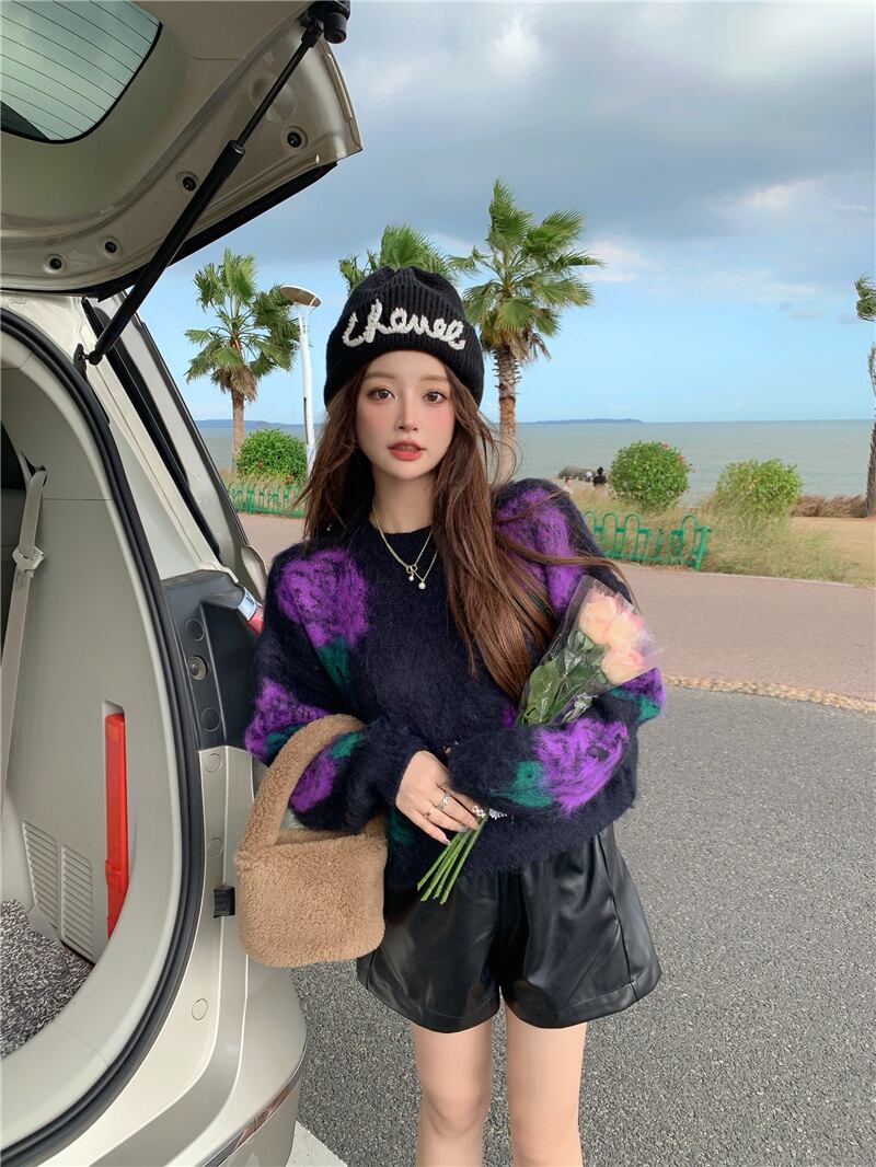 プルオーバー ローズニット モヘアニットセーター トップス セーター クルーネック ニットセーター 花柄 レトロ ラウンドネック. a3658