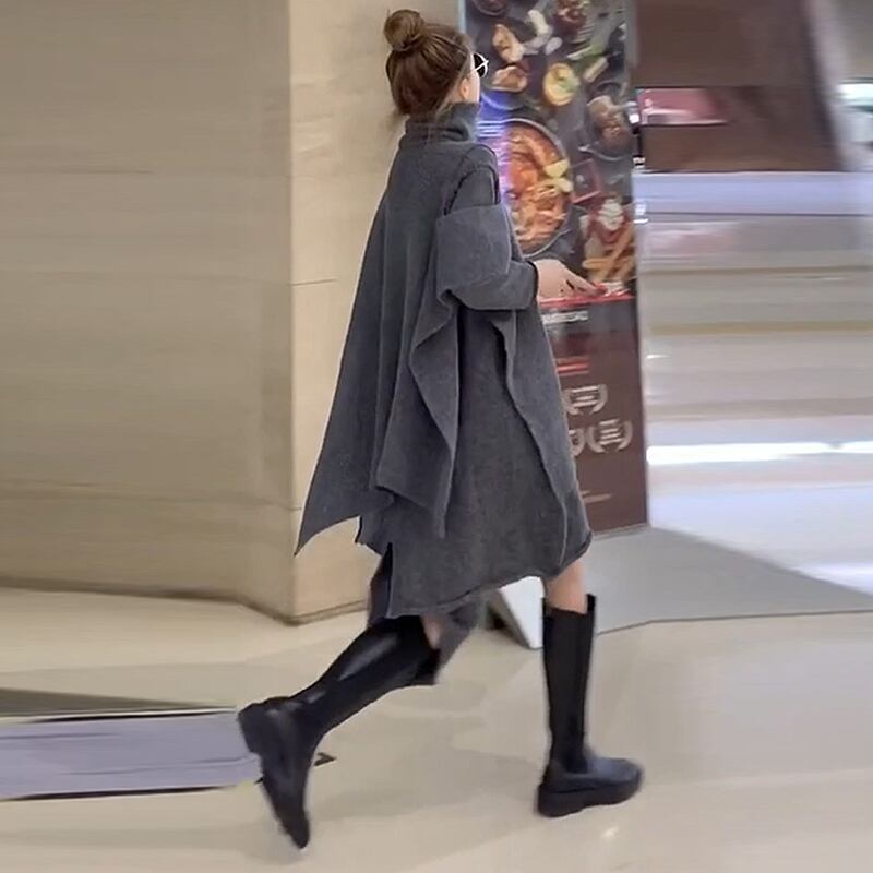 イレギュラーニットワンピとマントコートのオシャレなニットアップ