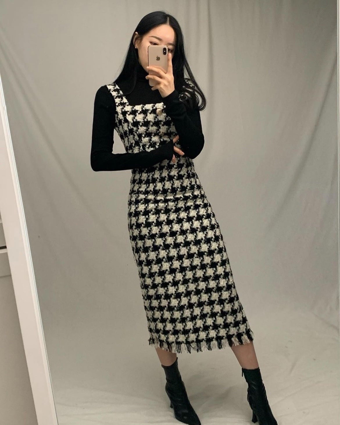 ツイードストラップワンピース 千鳥格子 フリンジ サスペンダーワンピース サスペンダースカート ワンピース a3842