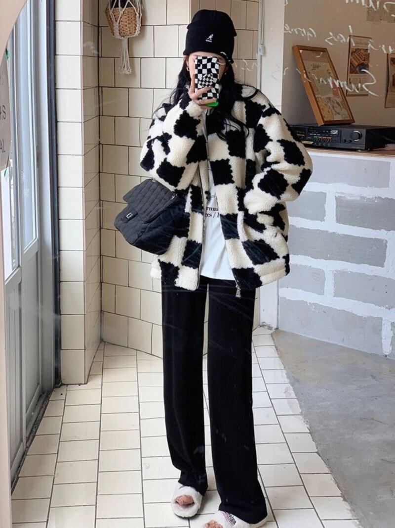 チェッカーボード柄 フリースジャケット ボアコート. ボアジャケット ボア コート ジャケット アウター 厚手 ウールコート. ベルベット a3840